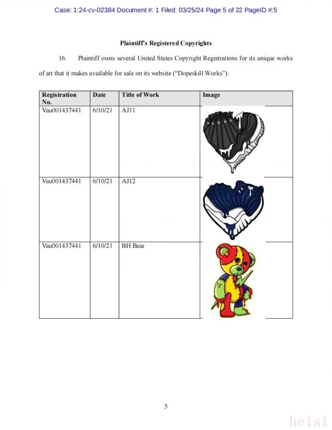 本案由Doniger律所代理Dope Ecommerce LLC針對旗下品牌Dopeskill發(fā)起版權(quán)&商標(biāo)維權(quán)案件,該案涉及注冊號為6532338的“Dopeskill”商標(biāo)以及多項服裝設(shè)計圖案;跨境賣家選品時注意避雷,未經(jīng)授權(quán)不得隨意使用。