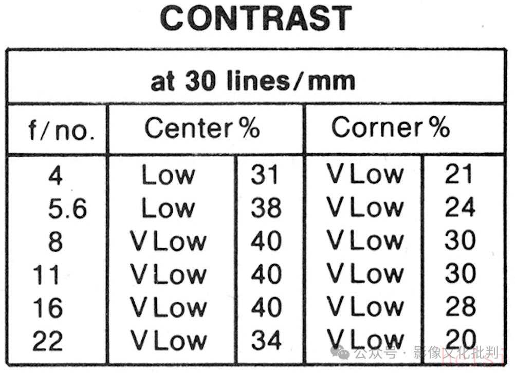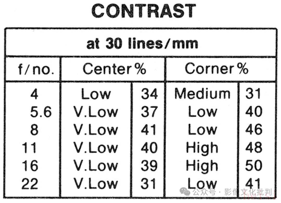 鏡頭的最高分辨率出現(xiàn)在f/16光圈,達(dá)到中心52線對(duì)/毫米、邊緣46線對(duì)/毫米;最高反差出現(xiàn)在f/8~11光圈,達(dá)到中心40、邊緣30。