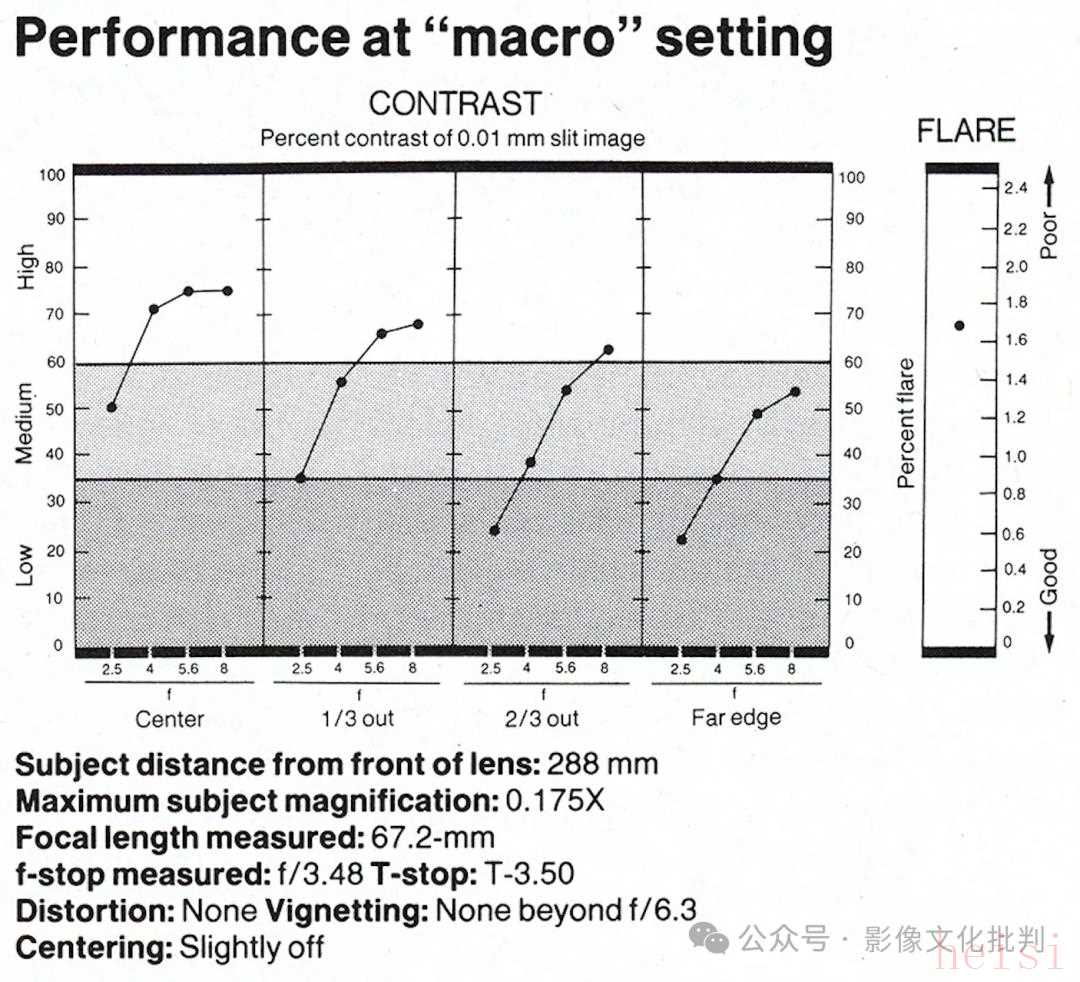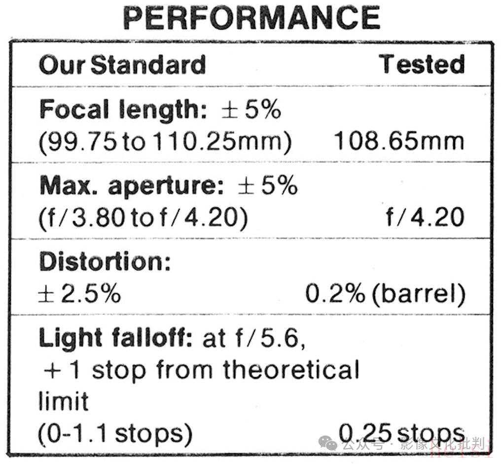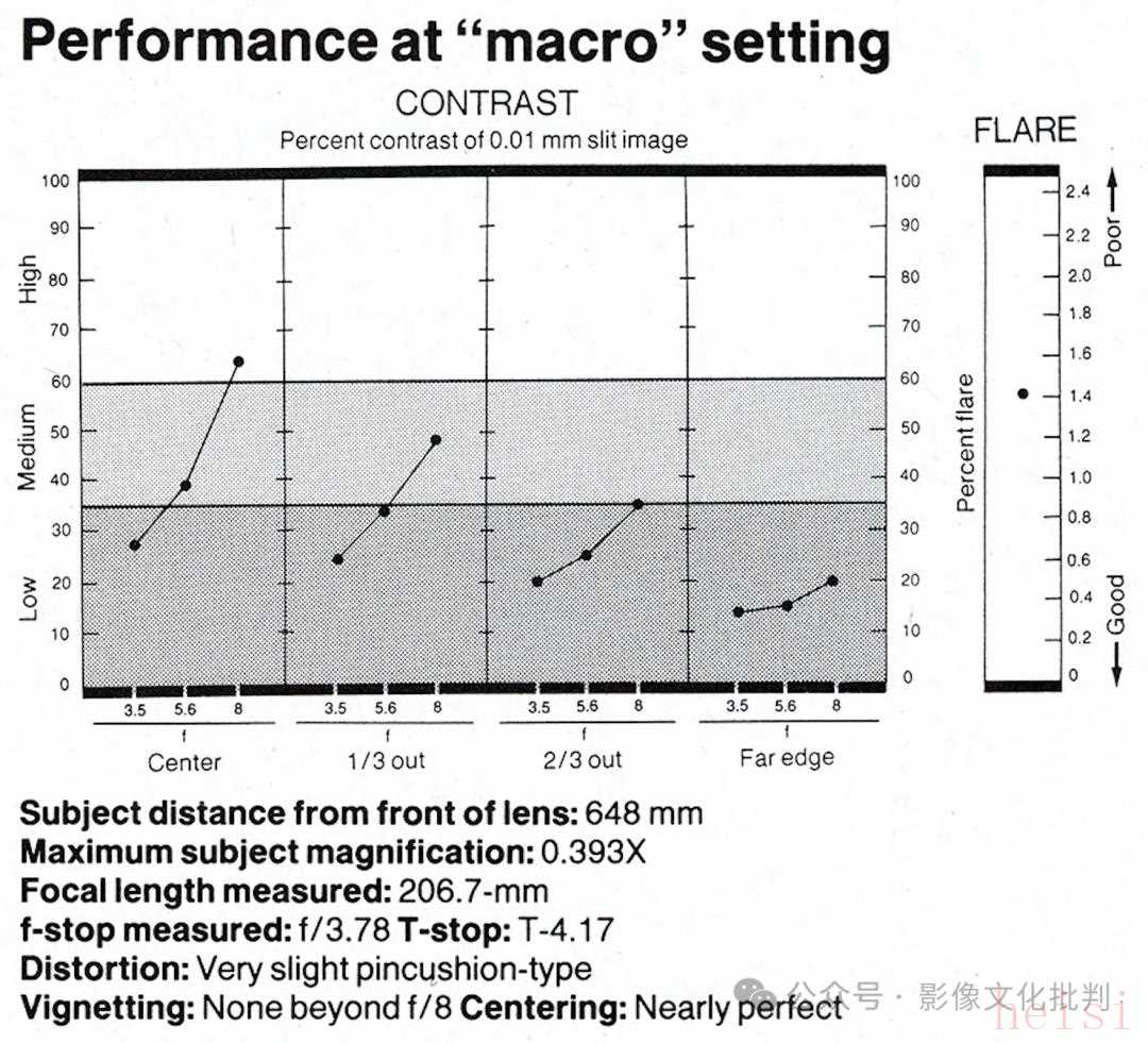 考慮到這支鏡頭的放大倍率介于1:1.7至2:1,因此《Modern Photography》沒(méi)有使用常見(jiàn)的1:46放大倍率標(biāo)準(zhǔn)對(duì)焦距離和1:4放大倍率微距距離測(cè)試鏡頭,而是直接使用了這支鏡頭更常用的1:1倍率測(cè)試。