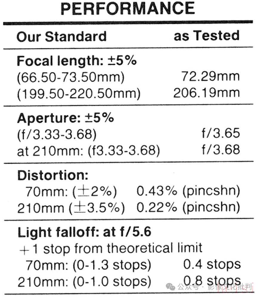這支鏡頭有兩個(gè)測(cè)試結(jié)果,我們先來(lái)看《Modern Photography》的評(píng)測(cè)。這支鏡頭的編號(hào)為1502494,售價(jià)1194美元。鏡頭實(shí)際焦距為72/29~206.19毫米,光圈為f/3.65~3.68,70毫米端有0.43%的枕形畸變,210毫米端有0.22%的枕形畸變;f/5.6光圈下,70毫米端邊緣失光為0.4檔,210毫米端為0.8檔。鏡頭光圈很大,但重量意外的輕,因此鏡筒使用塑料材質(zhì)是個(gè)明智的選擇。黃色的英制和白色的公制對(duì)焦標(biāo)尺非常清晰,各個(gè)焦段下都可以直接擰動(dòng)對(duì)焦環(huán)、方便地進(jìn)入微距模式,對(duì)焦和變焦環(huán)沒(méi)有輕易滑動(dòng)的跡象。