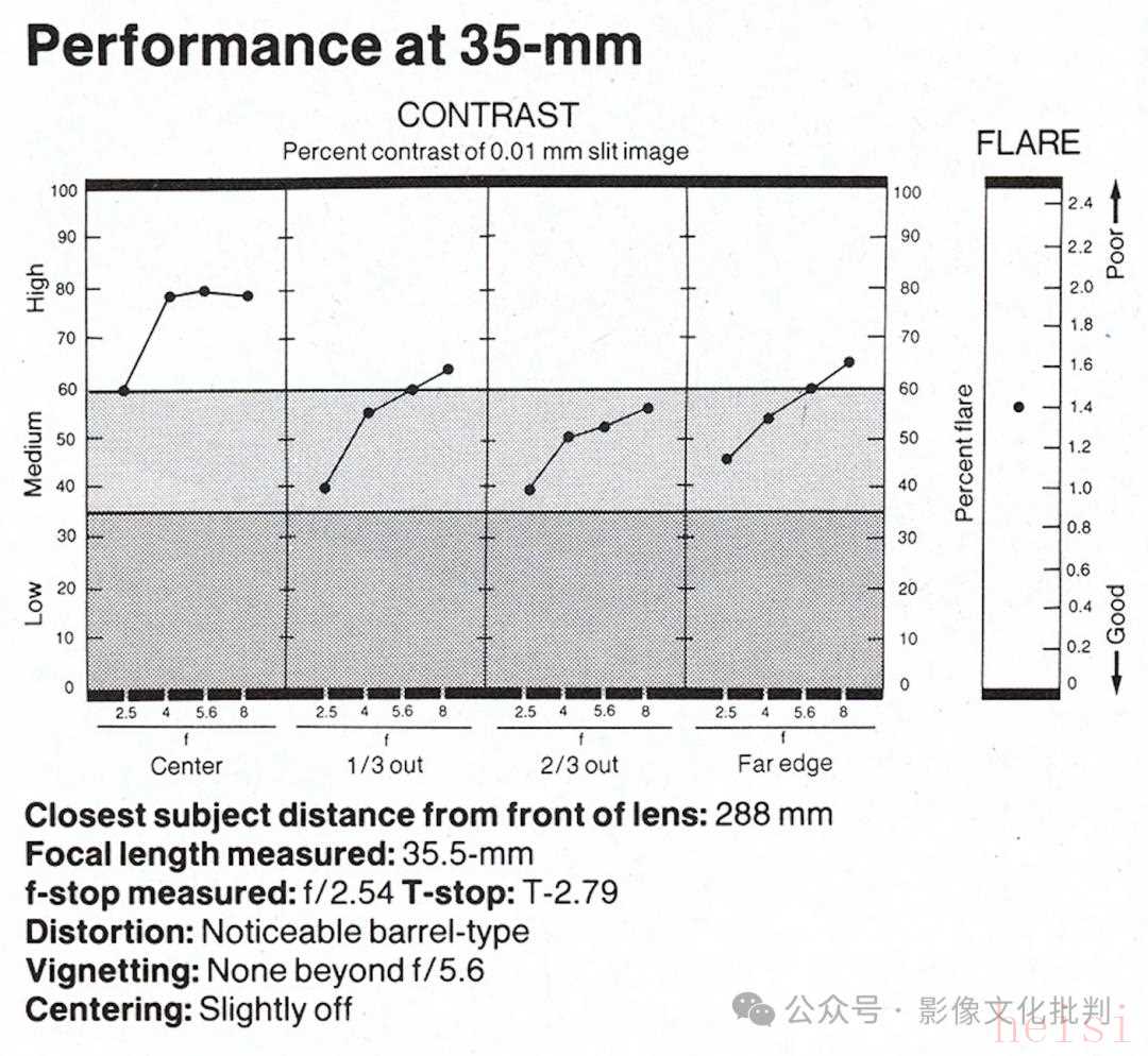 35毫米端,最近對(duì)焦距離下前鏡片到被攝物距離288毫米,鏡頭實(shí)際焦距為35.5毫米,光圈為f/2.54,T值為T(mén)-2.79,有明顯桶形畸變,收縮光圈到f/5.6后暗角消失,有輕微光軸不正問(wèn)題。此焦距下光圈全開(kāi)時(shí)鏡頭中心反差約為60,像場(chǎng)1/3~2/3處約為40,邊緣略高于45;收縮光圈到f/5.6后中心反差達(dá)到最高,約為80;繼續(xù)收縮光圈到f/8后中心反差稍有下降,像場(chǎng)1/3處約為65,2/3處超過(guò)55,邊緣超過(guò)65。炫光比例約為1.4%。