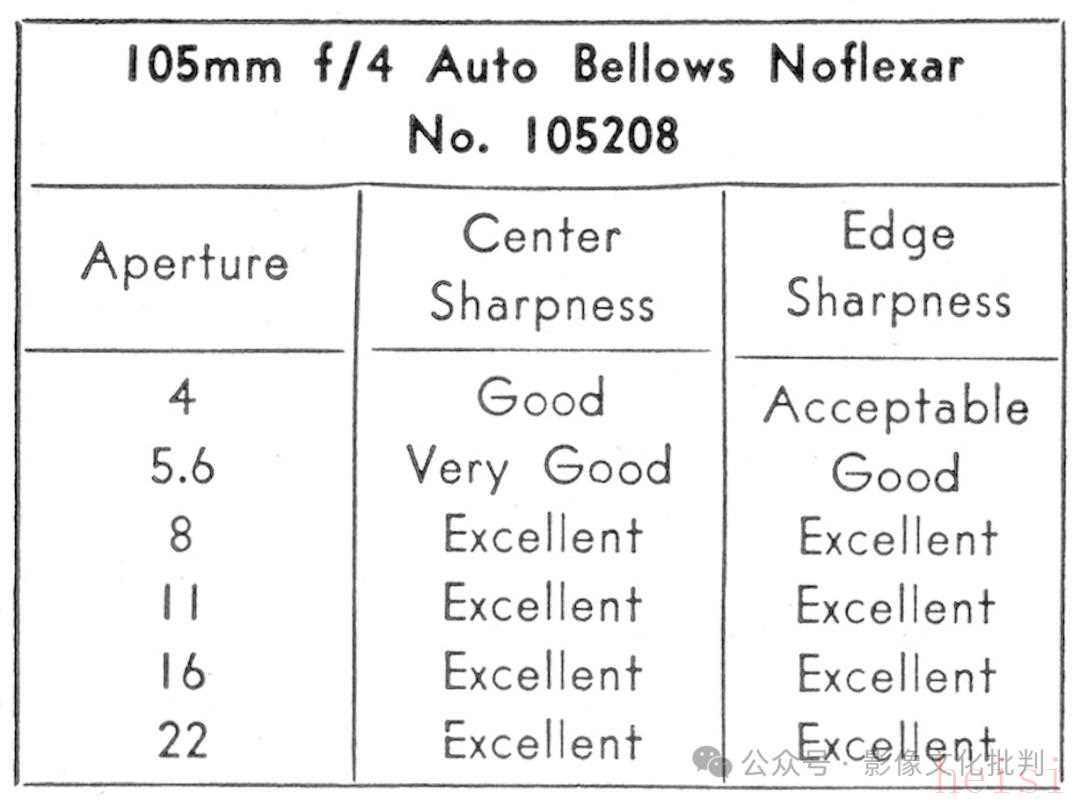 后期版本鏡頭售價(jià)232美元。鏡頭實(shí)際焦距為108.65毫米,光圈為f/4.20,有0.2%的桶形畸變,f/5.6光圈下邊緣失光為0.25檔。皮腔附件的價(jià)格、規(guī)格與 Novoflex Auto Bellows Marco Noflexar 60mm f/4.0 一致。這個(gè)皮腔結(jié)構(gòu)在設(shè)計(jì)時(shí)考慮了手持操作,即便安裝這支105毫米鏡頭也能像操作普通鏡頭一樣手持拍攝,但在小光圈、快門(mén)速度慢的時(shí)候必須使用三腳架。相比 Novoflex Auto Bellows Marco Noflexar 60mm f/4.0 鏡頭,這支鏡頭更強(qiáng)調(diào)增加拍攝距離、不會(huì)在動(dòng)物攝影時(shí)嚇到被攝物??紤]到鏡頭目前可以實(shí)現(xiàn)0.75的放大倍率,因此顯得導(dǎo)軌長(zhǎng)度不足(如果能做到1倍更好),雖然可以通過(guò)在皮腔結(jié)構(gòu)上安裝延長(zhǎng)筒增加微距表現(xiàn),實(shí)現(xiàn)高達(dá)1.5倍的放大倍率,但這有可能破壞附件的穩(wěn)定性。