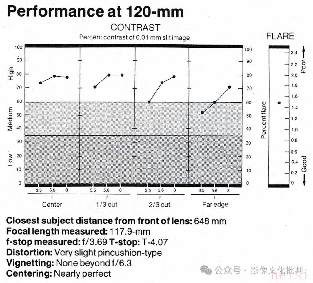 120毫米端,最軸向有非常輕微的球色差,收縮兩檔光圈后消失;能看到非常輕微的球差過(guò)矯正問(wèn)題,收縮光圈到f/16后達(dá)到衍射極限;離軸方向有非常輕微的斜向炫光、輕微慧差和一些橫向色散。此焦距下的最高分辨率出現(xiàn)在f/11光圈,達(dá)到中心70線對(duì)/毫米、邊緣63線對(duì)/毫米;最高反差出現(xiàn)在f/8光圈,達(dá)到中心66、邊緣57。