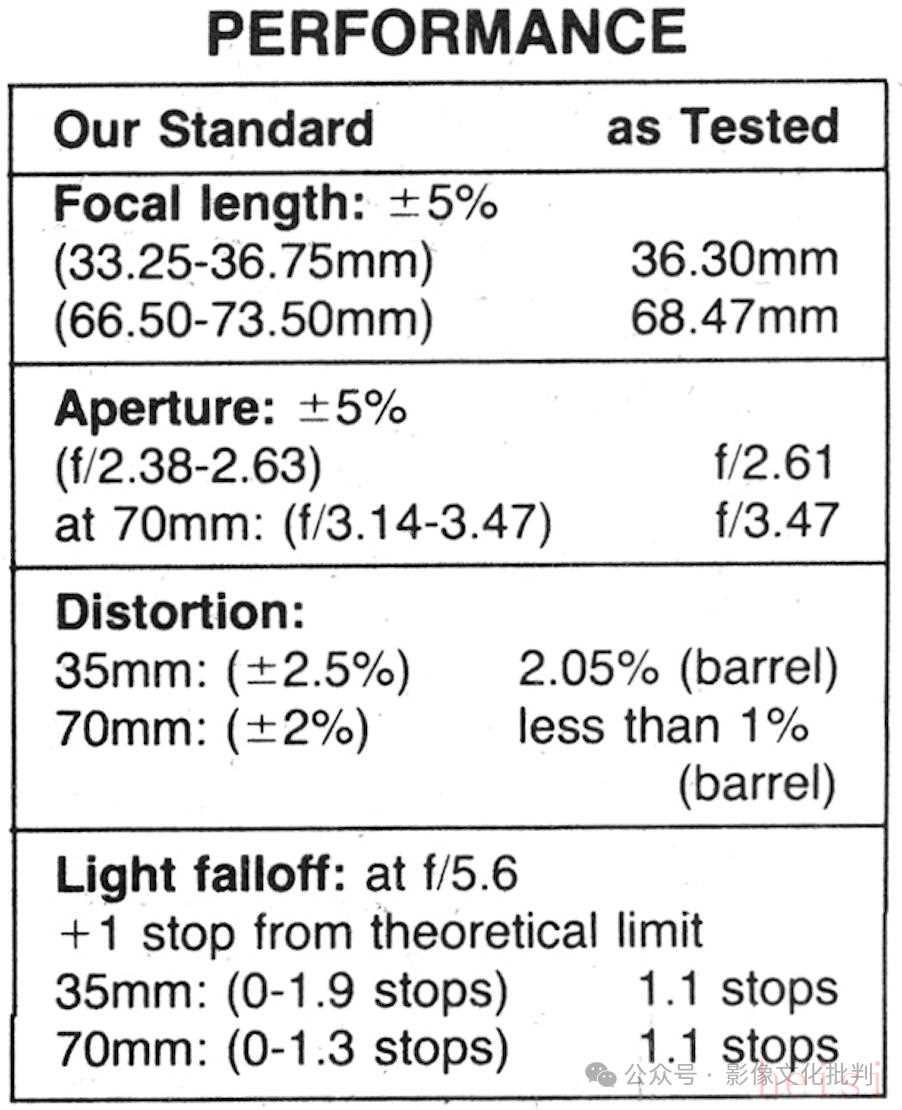 第二個(gè)測(cè)試結(jié)果來(lái)自《Popular Photography》雜志。鏡頭編號(hào)1509825,售價(jià)651美元。鏡頭對(duì)焦環(huán)與變焦環(huán)紋理相似,導(dǎo)致有時(shí)不是很容易區(qū)分。非恒定光圈的設(shè)計(jì)也需要用戶在使用無(wú)TTL測(cè)光相機(jī)時(shí)注意焦距變化時(shí)光圈的變化(雖然不到1檔)。鏡頭的變焦環(huán)比對(duì)焦環(huán)更加順滑,后者隨著對(duì)焦距離變近阻尼會(huì)增大,不過(guò)阻尼適中,不會(huì)輕易滑動(dòng)。鏡頭的最近對(duì)焦距離和對(duì)焦點(diǎn)不會(huì)因?yàn)榻咕嗟母淖兌淖?,因此可以在長(zhǎng)焦端完成精確對(duì)焦然后切換回廣角端拍攝。鏡頭有兩個(gè)主要鏡組,依靠?jī)山M對(duì)焦螺旋,它們向相反的方向移動(dòng)。前鏡組的對(duì)焦螺旋連接至三個(gè)彈簧支撐的墊片,用于實(shí)現(xiàn)廣角所需的更大前組面積。這個(gè)結(jié)構(gòu)成本高昂,但這些彈簧支撐的墊片會(huì)產(chǎn)生較大且不均勻的摩擦力,拆解去掉它們后鏡頭的對(duì)焦更加順滑,變焦阻尼也減輕。前鏡組螺旋的公母螺紋均由鋁制成,母螺紋與塑料鏡筒相連。前鏡組也包含了自動(dòng)光圈結(jié)構(gòu),它有一套包含滾珠結(jié)構(gòu)的低摩擦系統(tǒng)和消光處理非常好的葉片。后鏡組后面的方框主要用于遮光,有效避免了雜光在反光鏡箱內(nèi)的反射。鏡頭外部的對(duì)焦環(huán)、變焦環(huán)、光圈環(huán)均為塑料。