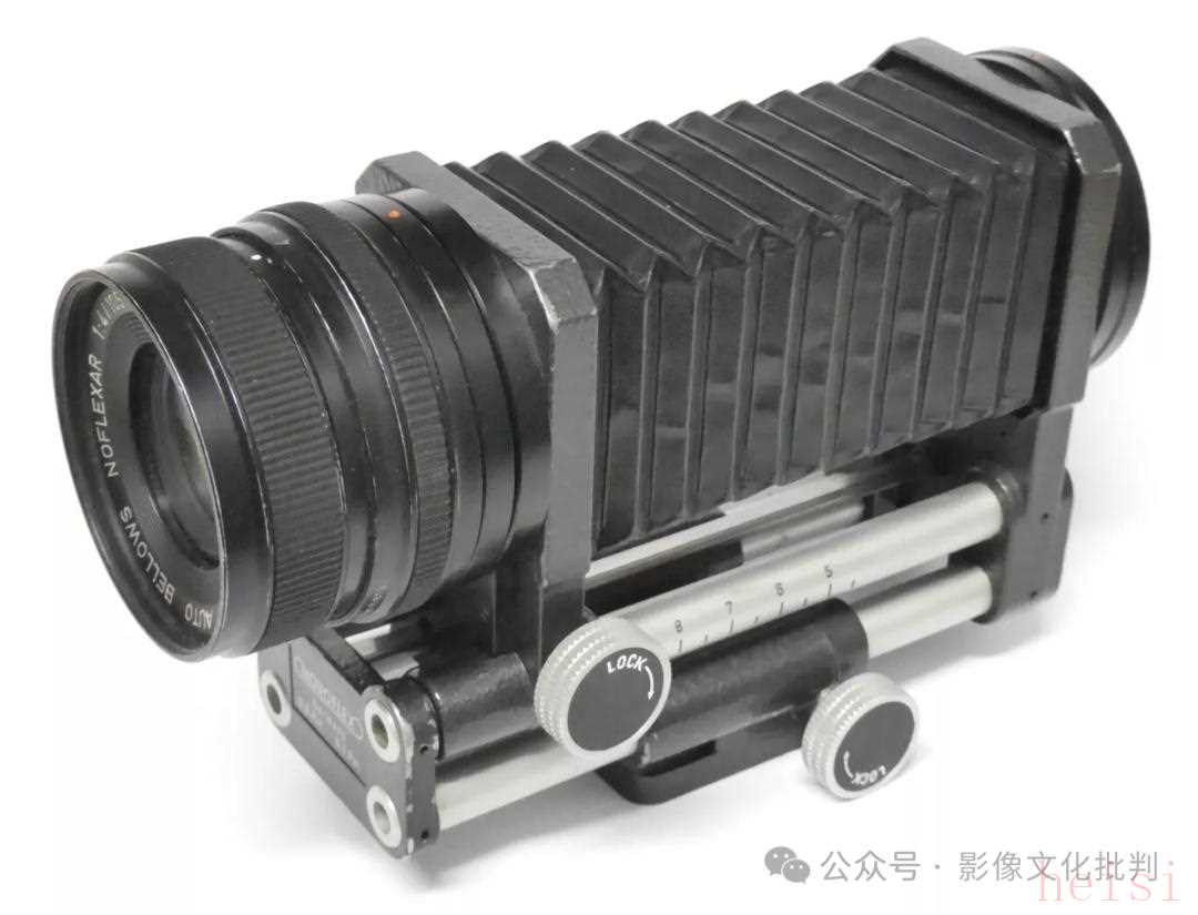 上圖的早期版本的編號(hào)為105208,鏡頭售價(jià)81美元,Model II 型皮腔附件售價(jià)82美元。這個(gè)鏡頭和皮腔附件的組合能夠從無(wú)限遠(yuǎn)連續(xù)對(duì)焦至1:1放大倍率,但需要注意的是,由于自動(dòng)光圈傳動(dòng)結(jié)構(gòu)的限制,這個(gè)皮腔附件的美能達(dá)卡口版本只支持縱向構(gòu)圖的拍攝;而且由于體積限制,這個(gè)附件沒(méi)有多余的空間提供全開(kāi)光圈測(cè)光的連桿,在測(cè)光時(shí)要注意收縮鏡頭的光圈。