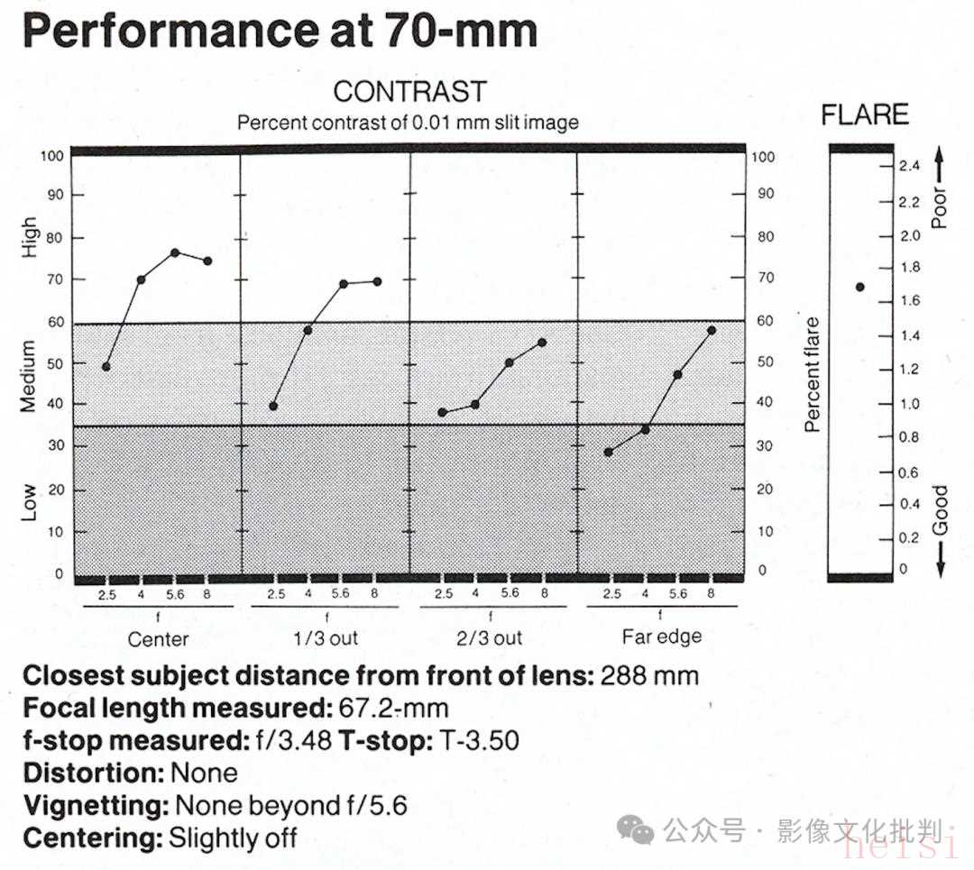 70毫米端,軸向表現(xiàn)與更廣角端一致,收縮光圈到f/11后達(dá)到衍射極限;離軸方向有輕微像散和慧差,收縮光圈到f/8后消失,輕微橫向色散始終存在。此焦距下的最高分辨率出現(xiàn)在f/8光圈,達(dá)到中心63線對(duì)/毫米、邊緣50線對(duì)/毫米;最高反差出現(xiàn)在f/5.6光圈,達(dá)到中心66、邊緣33。