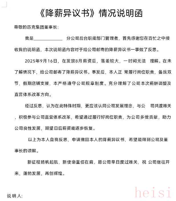 降薪后,部分員工向公司總部提交了《降薪異議書》。
