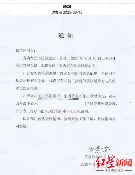9月16日,小穎在公司辦公軟件上收到了從董事長(zhǎng)辦公室發(fā)出,由董事長(zhǎng)許景南簽字的《通知》,《通知》稱降薪調(diào)整經(jīng)過(guò)了充分溝通與意見(jiàn)征集;同時(shí),對(duì)人力資源中心三名相關(guān)人員予以停薪停職處理。