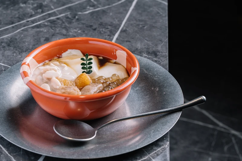他們從最基本的豆花製法開始反覆實驗,較真的程度讓人驚嘆!從黃豆的品種、浸泡時間、水的硬度、鹽滷比例,都經(jīng)過一再測試。且,店內(nèi)使用美國有機黃豆與磁化軟水,磨漿、分離、凝結(jié)的每一步都講求細緻。最終呈現(xiàn)出的豆花細滑、柔韌、帶著自然豆香,是整個創(chuàng)作的基礎(chǔ)。