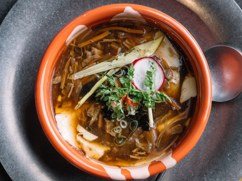 以酸辣豆腐煲結(jié)合臺式酸辣湯為出發(fā),將香菇、金針菇、山東白菜、紅蘿蔔等時蔬配料炒過后添加醬油、白醋與胡椒製成酸爽微辛的滷水,并且再添入珍貴的紅毛苔、髮菜等佐料,搭配鹽滷豆花入口,滑嫩暢快又開胃,甚至可以直接當(dāng)作主食品嚐?。|區(qū)微醺豆花店限定)