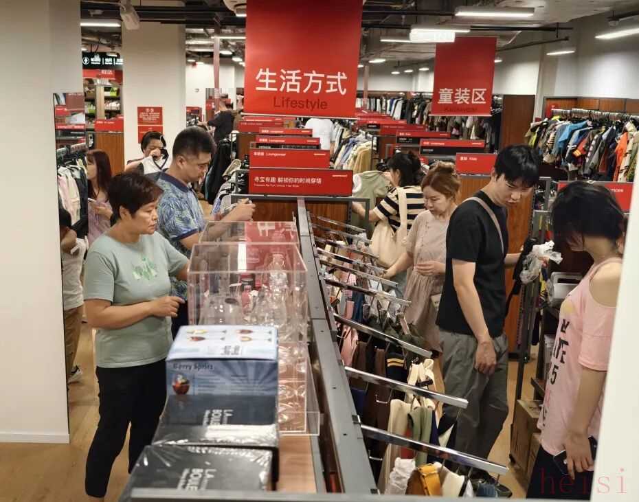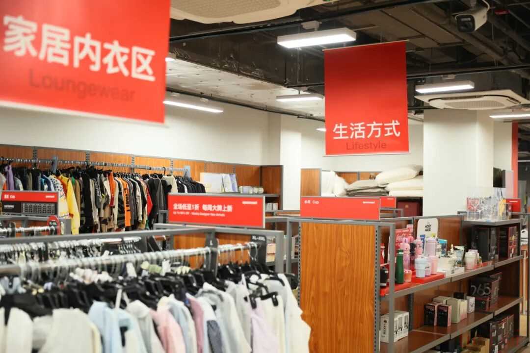 一層靠近長寧路一側,是每周限時開放的快閃特賣區(qū),一到周四的“開倉”時間就擠滿尋貨的消費者;地下一層則是主力選購區(qū),集中陳列著服飾、鞋履、日用品等品類,貨架布局清晰卻不失“尋寶感”,市民可隨手翻看挑選,收銀臺也設于此,逛買結賬一站式完成,無需上下奔波。