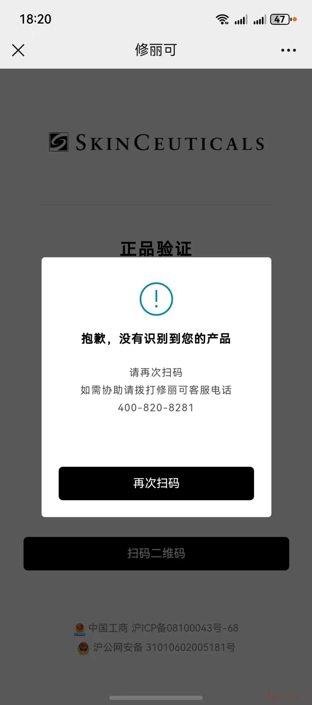 遇到類似情況的還有消費者張女士。2024年12月11日,張女士在淘寶“修麗可”官方旗艦店購買了一款原價為625元的修麗可色修精華。12月14日,收到快遞后掃描商品包裝盒側(cè)粘貼的防偽二維碼,頁面跳轉(zhuǎn)顯示“抱歉,沒有識別到您的產(chǎn)品”,且多次掃描均無法識別。