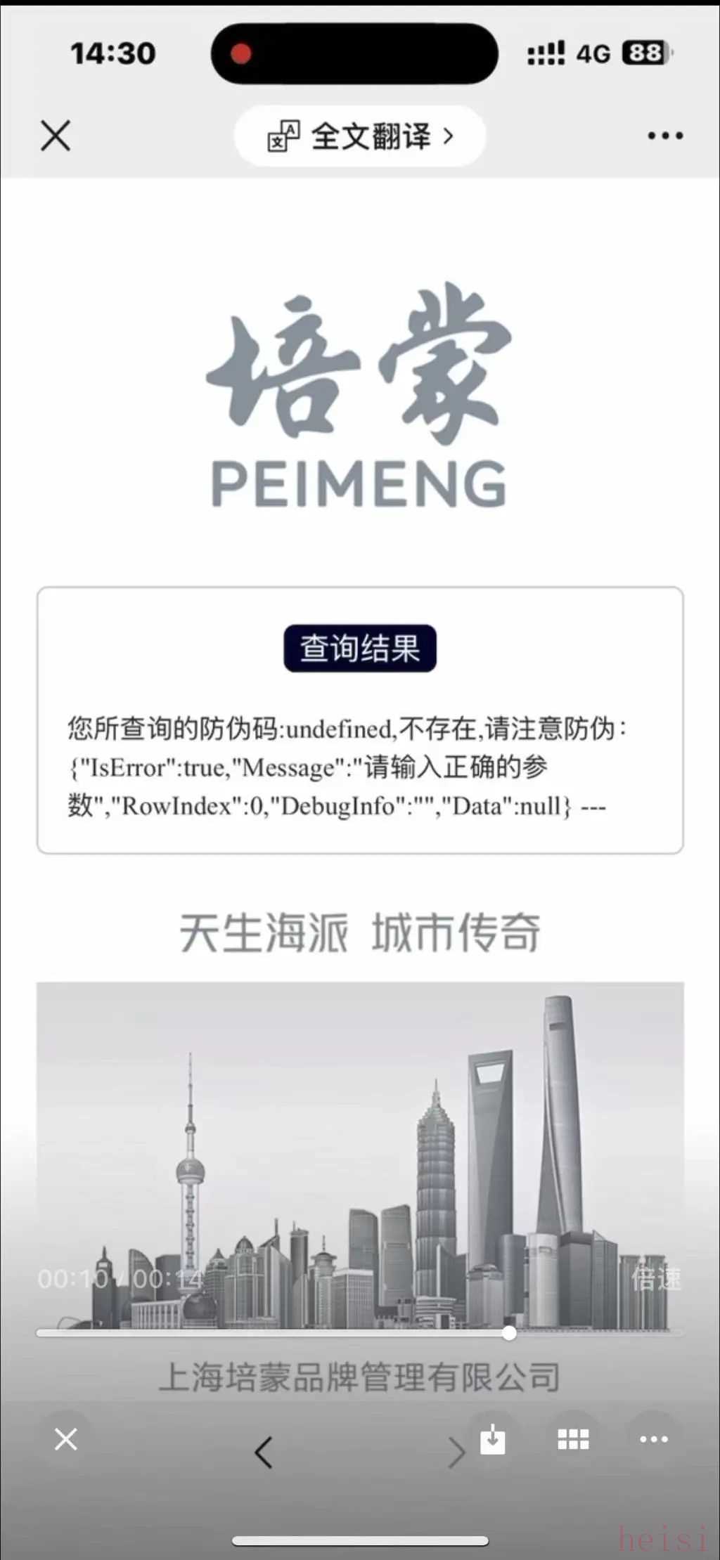 許林找到培蒙官方微信公眾號,掃碼驗證吊牌防偽碼結(jié)果顯示,所查詢的防偽碼不存在,請注意防偽。