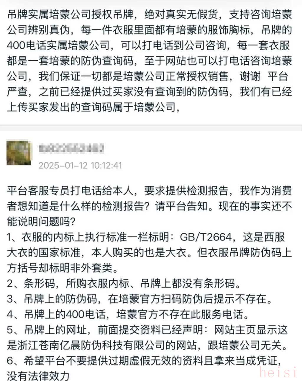同樣的,2025年1月11日,許林投訴至淘寶,隨后賣家“培蒙男裝輕奢服飾店”提供了反駁材料,包括培蒙的生產(chǎn)許可證品牌授權(quán)書和進(jìn)貨單。