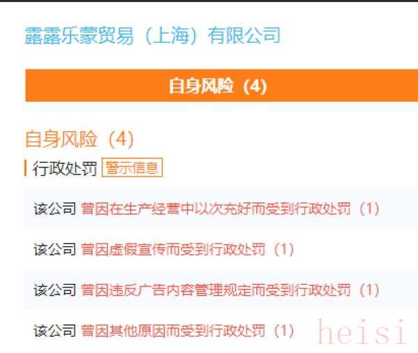 天眼查同時(shí)顯示,露露樂蒙貿(mào)易(上海)有限公司有4條行政處罰記錄,其中2019年8月份的行政處罰是因“在生產(chǎn)經(jīng)營中以次充好”,另外兩例為“違反廣告內(nèi)容管理規(guī)定”和“虛假宣傳”,還有一例是因其他原因而受到行政處罰。
