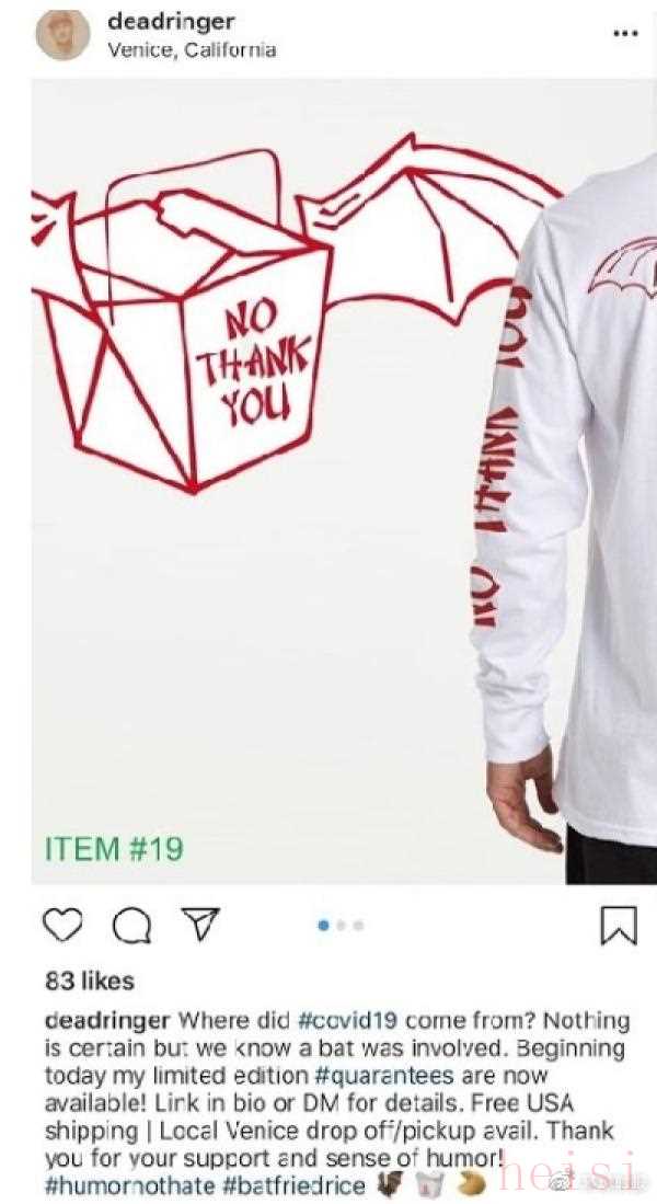 露露樂蒙此次“辱華襯衫事件”的發(fā)酵,起源于一個(gè)名叫Jess Sluder的美國設(shè)計(jì)師。該設(shè)計(jì)師在個(gè)人網(wǎng)店上推出了一款名為“BAT FRIED RICE(蝙蝠炒飯)”的襯衫,該襯衫正面印有一個(gè)長著蝙蝠翅膀的筷子圖案,背面印有一個(gè)長著蝙蝠翅膀的餐盒圖案,襯衫上還印有“NO THANK YOU”字樣。該設(shè)計(jì)師配文稱,“沒人確定新冠肺炎從哪里來,但我們知道蝙蝠涉及其中...謝謝你們的支持和幽默感”。