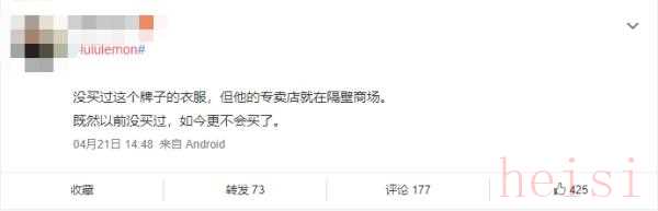 雖然Jess Sluder在鋪天蓋地的質(zhì)疑聲中撤下了襯衫鏈接并發(fā)文進(jìn)行了道歉,還特別強(qiáng)調(diào)該款襯衫和Trevor Fleming以及Lululemon沒有任何關(guān)系,但是網(wǎng)友的怒火并沒有平息,“Lululemon辱華”的相關(guān)話題在微博上引起了熱烈討論,有網(wǎng)友甚至表示“沒買過這個(gè)牌子的衣服,如今更不會(huì)買了”。