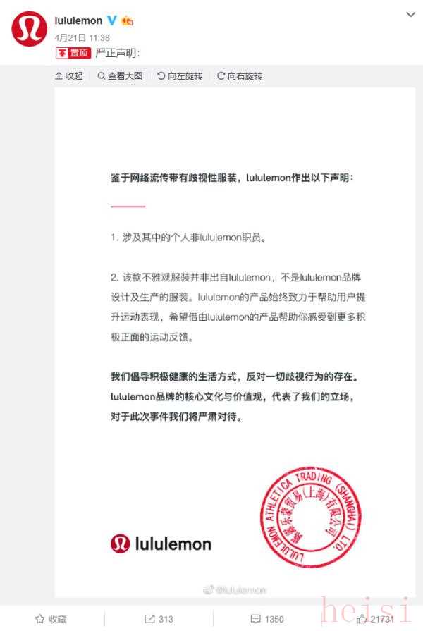 或許是迫于輿論壓力,微博認(rèn)證為“露露樂蒙貿(mào)易(上海)有限公司”的微博賬號(hào),昨日(21日)中午發(fā)布“嚴(yán)正聲明”稱,“涉及其中的個(gè)人非lululemon職員;該款不雅觀服裝并非出自lululemon,不是lululemon品牌設(shè)計(jì)及生產(chǎn)的服裝。”