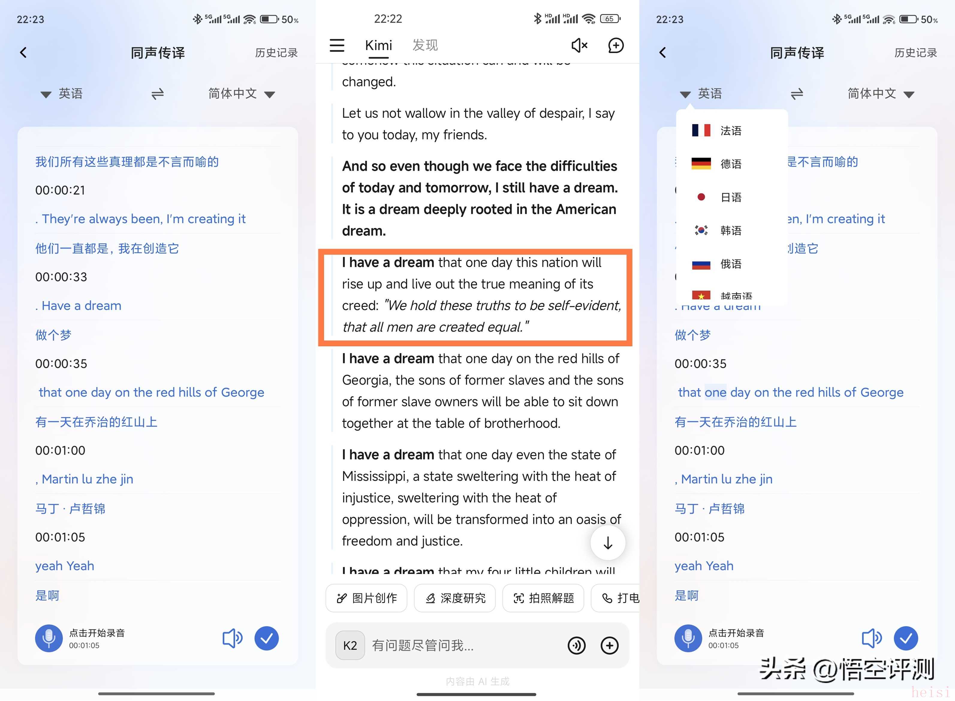 同樣識別非常精準(zhǔn),大家可以看一下,在耳機(jī)開啟同聲傳譯功能的錄音后,可以識別到外部的語言,耳機(jī)內(nèi)會自動播報(bào)中文,真正的同聲傳譯。