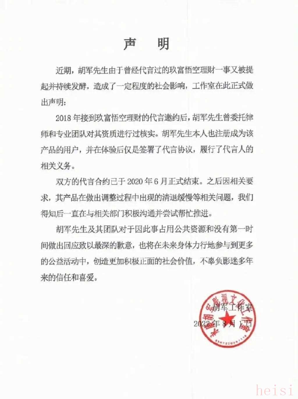 2018年接到玖富旗下理財?shù)拇匝s后,胡軍曾委托律師和專業(yè)團隊對其資質(zhì)進行核實,胡軍本人也成為該產(chǎn)品的用戶,在體驗后僅簽署了代言協(xié)議。雙方的協(xié)議已經(jīng)于2020年6月正式結(jié)束,之后因相關(guān)要求,其產(chǎn)品在做出調(diào)整過程中出現(xiàn)的清退緩慢等問題,在得知后一直在與相關(guān)部門進行積極溝通并嘗試幫忙推進。