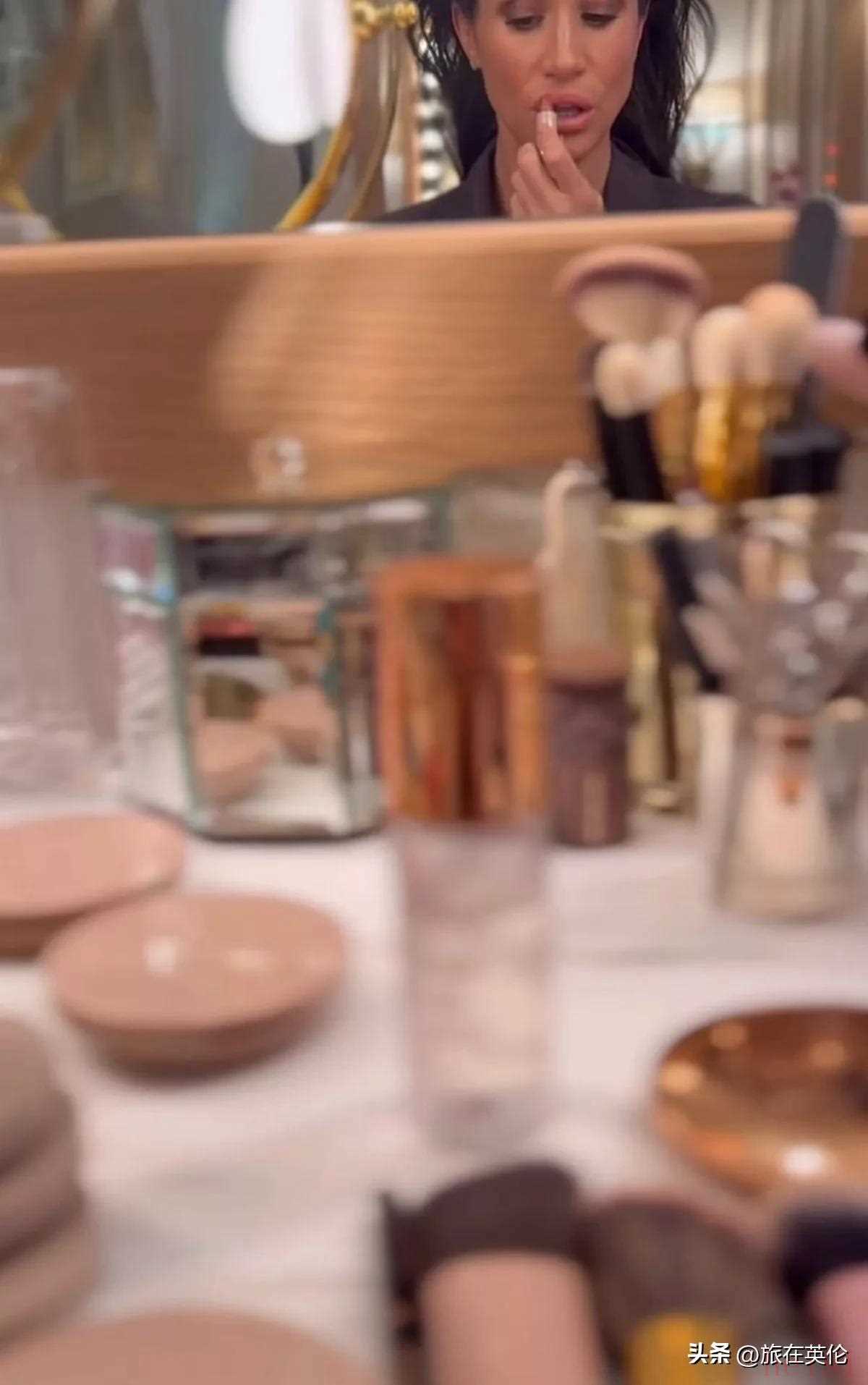 梅根隨后拍攝了一段她化妝過(guò)程的視頻,鏡頭放大了梳妝臺(tái)上排列的化妝品瓶和刷子,同時(shí)她對(duì)著鏡子涂著粉色口紅。