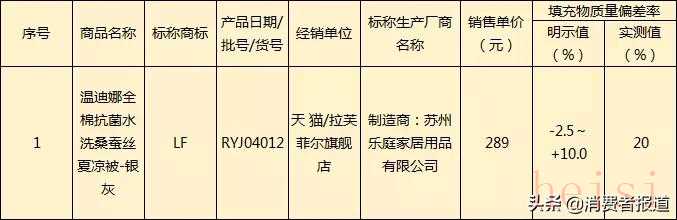 經(jīng)測試,20件蠶絲被樣品中只有一件樣品蠶絲被填充物質(zhì)量偏差率超出標準要求范圍,達到120%。
