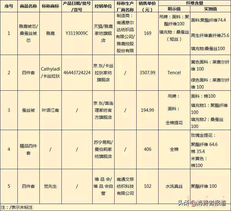 本次比較試驗樣品由京津冀消費者協(xié)會工作人員以消費者的身份從實體店及京東商城、蘇寧易購、天貓商城、拼多多、唯品會、小米有品等電商平臺隨機購買了100件樣品,包括床單、被罩、床品套件樣品80件,蠶絲被樣品20件,基本覆蓋了市場上銷售的主流品牌,購買單價從58元到6297.99元不等。