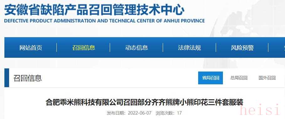 根據(jù)中國消費者協(xié)會等發(fā)布的消費警示信息,安徽合肥乖米熊科技有限公司被通報存在質(zhì)量問題,并決定召回部分齊齊熊牌小熊印花三件套服裝。