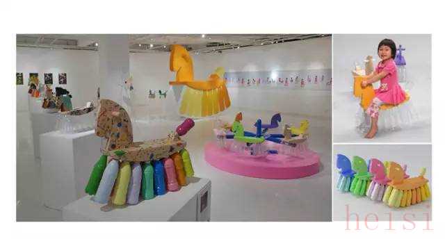 我的搭檔石川在2011年自主開發(fā)了一個環(huán)保型產(chǎn)品——搖搖木馬,用廢棄的塑膠水瓶組成搖搖木馬的腿,小朋友可以坐在上面玩,鼓勵大家回收礦泉水瓶,買木馬回家以后組合自己的玩具。