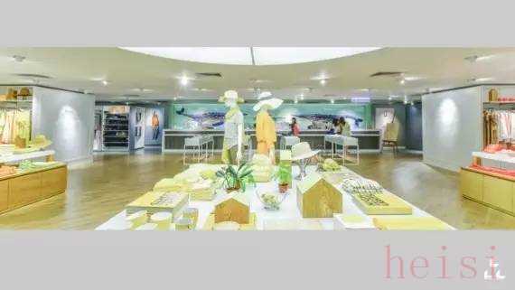 這家店是2013年廣州最老的店,在室內(nèi)空間設計的時候,我們盡可能地提供容器的感覺,讓它的產(chǎn)品有效地表達出來,以及研究怎么有效地把多元化的產(chǎn)品以生活方式表達呈現(xiàn)出來。我們在大的頭臺前面,產(chǎn)品不是像以往按同品類產(chǎn)品放一起來陳列,而是夏季的時候用黃色做了一組以陽光為主題,和陽光相關的生活方式進行陳列。