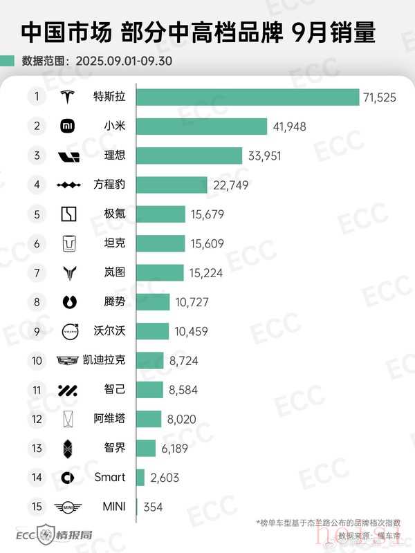 【CNMO科技消息】近日,基于數(shù)據(jù)機(jī)構(gòu)統(tǒng)計(jì)的2025年9月銷量數(shù)據(jù),中國(guó)市場(chǎng)部分中高檔汽車品牌的月度銷量排名正式揭曉。其中,特斯拉以顯著優(yōu)勢(shì)奪得銷量冠軍。
