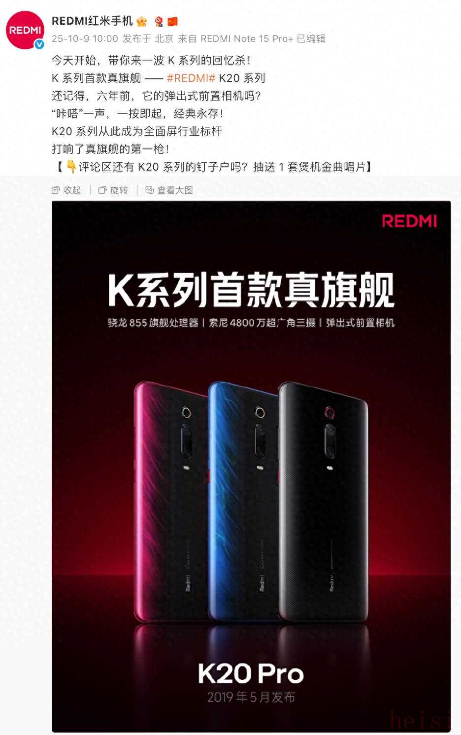如上圖所見,REDMI紅米手機(jī)官方微博表示“ 今天開始,帶你來一波K系列的回憶殺! ” 率先回顧了 K系列首款真旗艦 —— REDMI K20系列,并詢問是否還有K20系列的釘子戶~