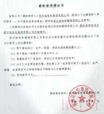 杭州娃哈哈服飾有限公司杭州分公司客服人員向記者出示了一份商標(biāo)使用授權(quán)書。其內(nèi)容顯示,杭州娃哈哈集團(tuán)有限公司于2021年9月授權(quán)杭州娃哈哈服飾有限公司使用商標(biāo)用于商品設(shè)計、生產(chǎn)、銷售等環(huán)節(jié)。