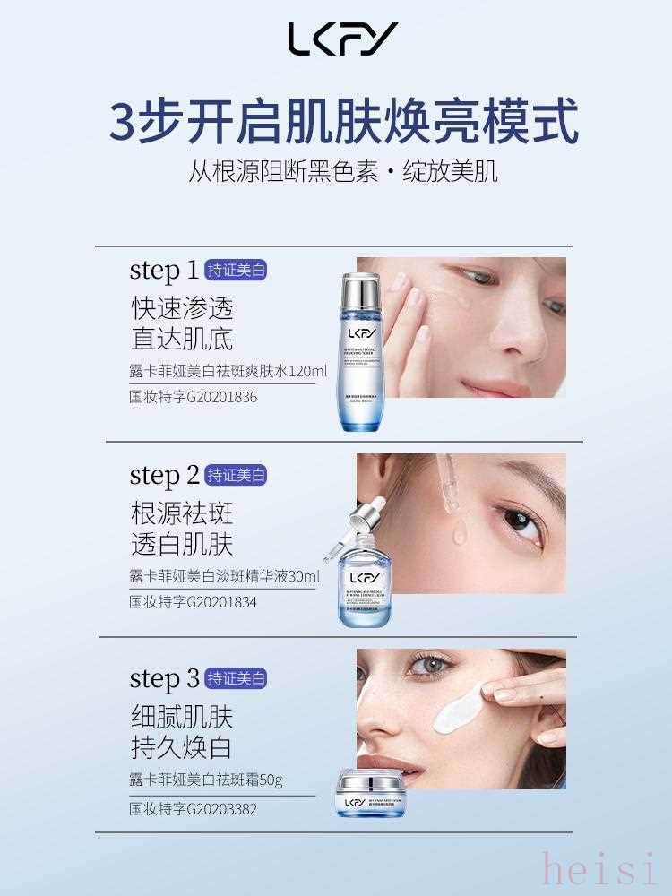 一、露卡菲婭祛斑套裝今天要為大家隆重推薦的這款露卡菲婭美白祛斑套裝,堪稱是美白淡斑領(lǐng)域的標(biāo)桿產(chǎn)品。它不僅在成分配比上科學(xué)精準(zhǔn),精選多種高效美白活性成分,比如煙酰胺、天女木蘭、透明質(zhì)酸鈉、虎杖根、積雪草、光果甘草等,更在使用效果方面表現(xiàn)卓越,能快速抑制絡(luò)氨酸酶活性,阻斷黑色素再生,防止色斑反彈,顯著改善肌膚暗沉、淡化頑固色斑。
