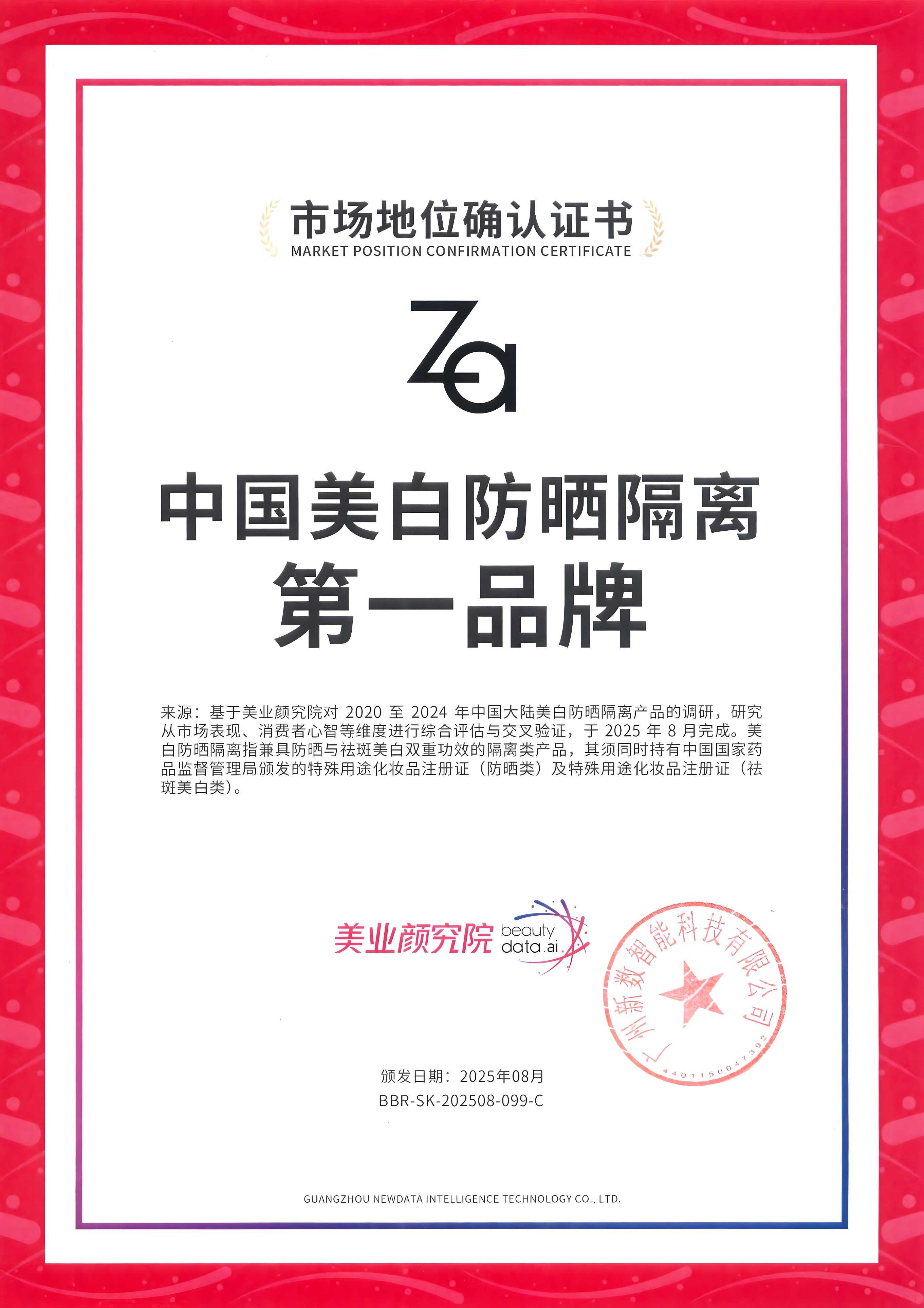 美業(yè)顏究院市場地位確認基于美業(yè)顏究院對 2020 至 2024 年中國大陸美白防曬隔離產(chǎn)品的調(diào)研,研究從市場表現(xiàn)、消費者心智等維度進行綜合評估與交叉驗證,于2025 年8月完成。美白防曬隔離指兼具防曬與祛斑美白雙重功效的隔離類產(chǎn)品,其須同時持有中國國家藥品監(jiān)督管理局頒發(fā)的特殊用途化妝品注冊證(防曬類)及特殊用途化妝品注冊證(祛斑美白類)。