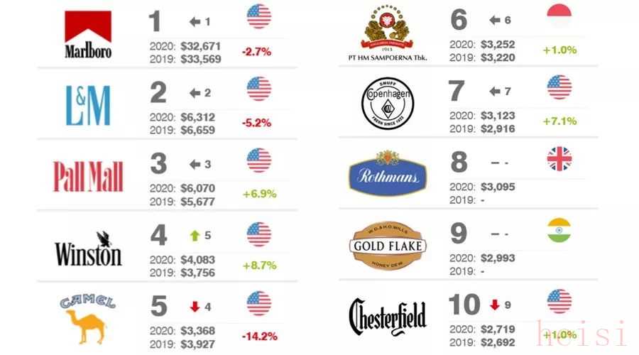 根據(jù)市場研究公司Brand Finance在2021年發(fā)布的《2020全球最有價值的煙草品牌排行榜》(The Most Valuable Tobacco Brands 2020),以下是當(dāng)時全球最有價值的10大煙草品牌及其估值(單位:億美元):
