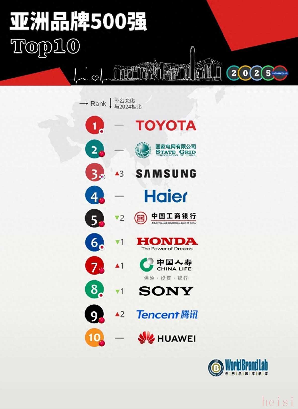 9月24日,由世界品牌實(shí)驗(yàn)室主辦的“亞洲品牌大會(huì)”在香港召開(kāi)。大會(huì)揭曉2025年(第二十屆)《亞洲品牌500強(qiáng)》排行榜,來(lái)自20個(gè)國(guó)家和地區(qū)的超級(jí)品牌入選,豐田、國(guó)家電網(wǎng)、三星、海爾、中國(guó)工商銀行位列榜單前五。其中,海爾連續(xù)20年上榜亞洲品牌500強(qiáng),蟬聯(lián)第四。
