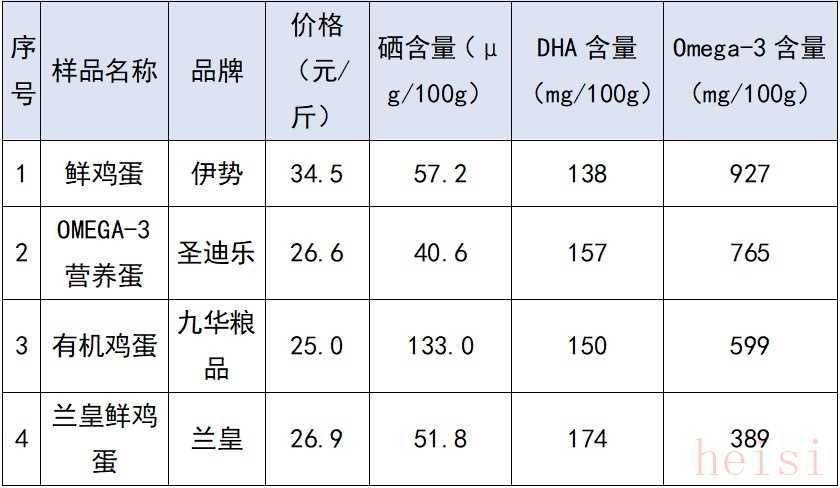 綜合硒、“DHA”和“Omega-3”含量情況,4款樣品表現(xiàn)較好,涉及伊勢(shì)鮮雞蛋、圣迪樂(lè)OMEGA-3營(yíng)養(yǎng)蛋、九華糧品有機(jī)雞蛋以及蘭皇鮮雞蛋。