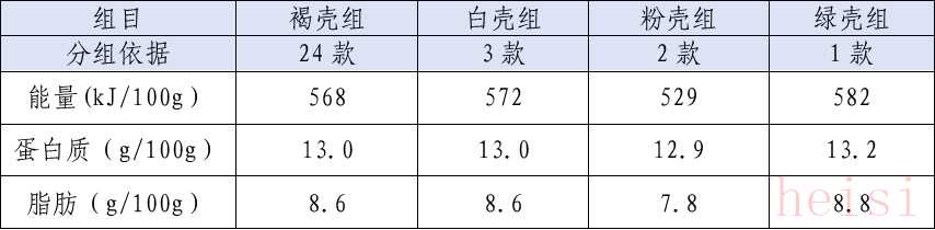 按照不同蛋殼顏色分組的試驗(yàn)結(jié)果