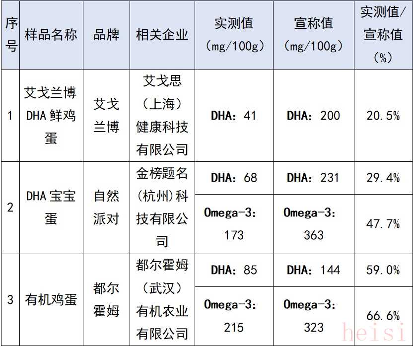 都爾霍姆有機(jī)雞蛋“DHA”宣稱值為144mg/100g,實(shí)測(cè)值為85mg/100g,實(shí)測(cè)值僅為宣稱值的59%。