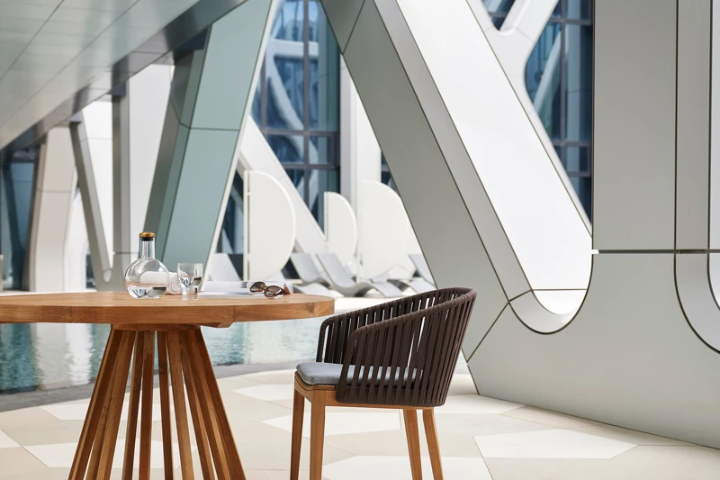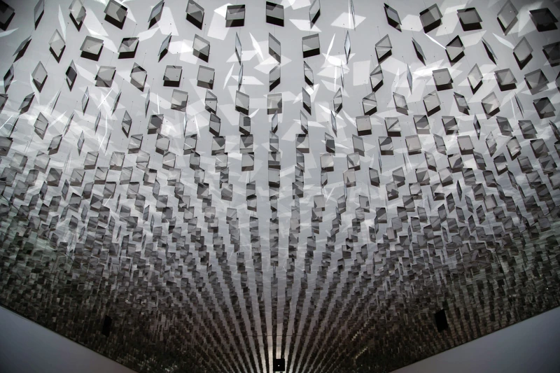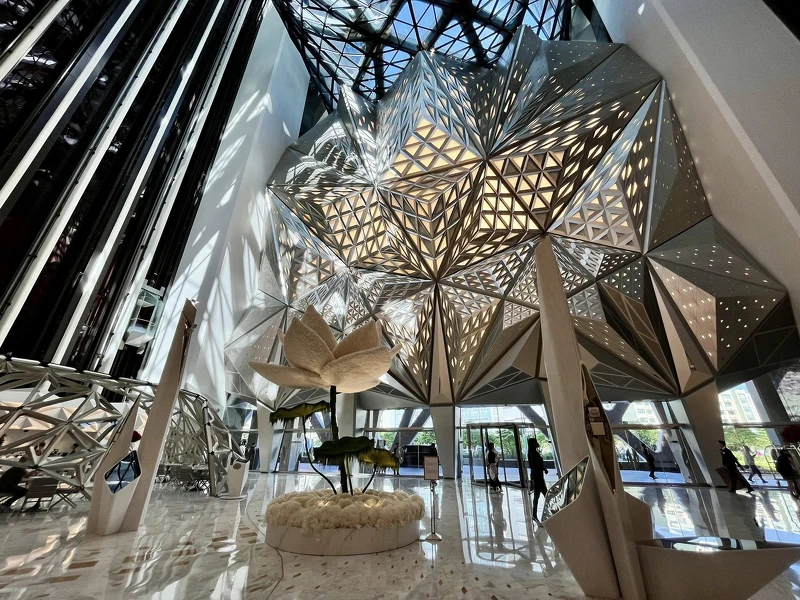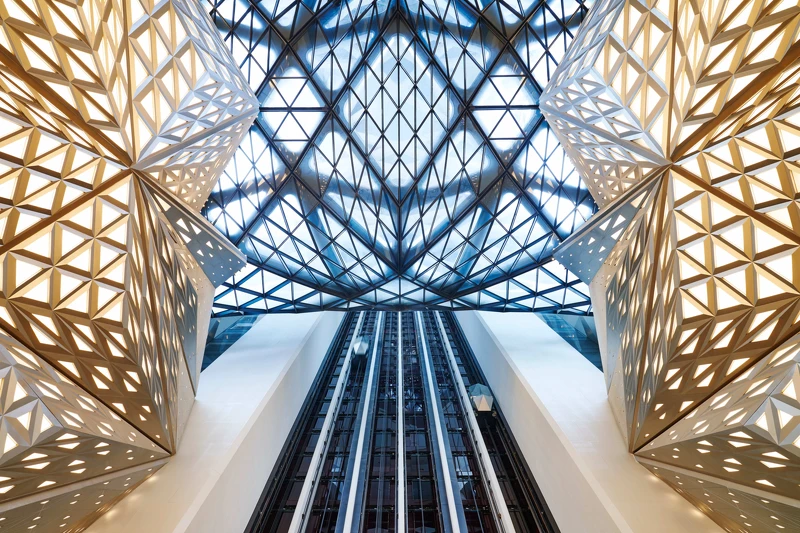 進入挑高約 40 公尺的一樓中庭大廳,可以看見三角幾何設計的空調(diào)系統(tǒng)。透過玻璃天窗推移的光影,特別是上午的光線非常美麗,為札哈.哈蒂的設計增添通透的氛圍。兩側(cè)共 12 部快速升降的未來感,可以自由穿梭在這座建筑的流線間,欣賞建筑內(nèi)外的景致。