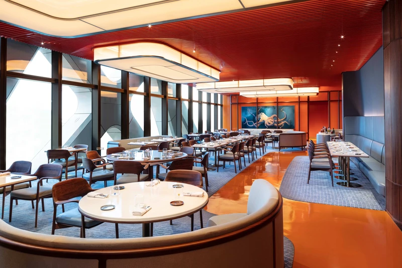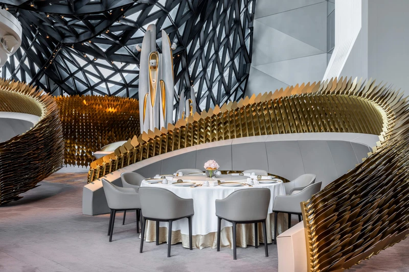 目前長期展出國際知名藝術家 KAWS 作品《Good Intentions》、法國觀念數(shù)藝術家 Daniel Buren 宛如彩虹寶盒般的裝置藝術,以及英國藝術家 Mr Doodle 特別為酒店製作的雕塑《Doodle COD》。則以龍麟的意象概念,打造用餐的隱私空間。
