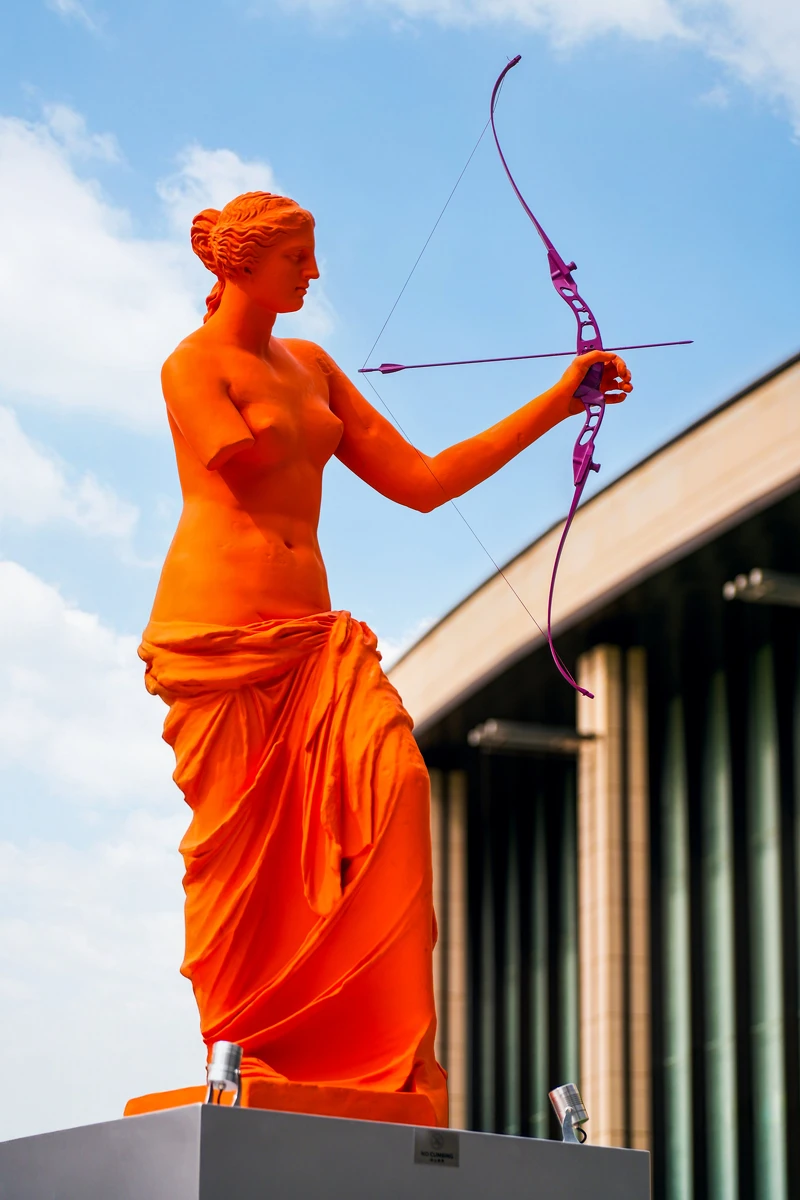 紫色維納斯揮舞網(wǎng)球拍,黃色肩扛沖浪板,藍色定格于籃球比賽的激烈瞬間。最具象徵意義的橙色維納斯,保留一只斷臂,另一手高舉弓箭,代表殘奧會的射箭項目,向殘障運動員致以敬意。綠色維納斯戴上鮮紅拳擊手套,彰顯堅毅與對抗;紅色維納斯則以標槍投擲的動感姿態(tài)展現(xiàn)力量與速度。維納斯女神不再只是靜止的美學符號,更在此挑戰(zhàn)男性主導的體育敘事。