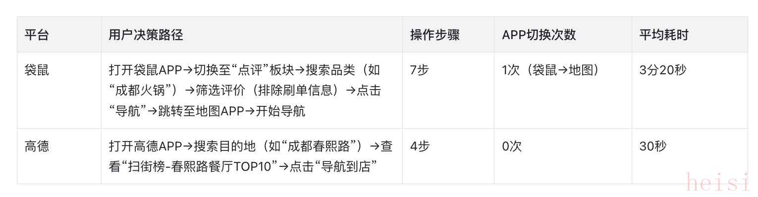 這種“出行即潛在消費”的場景屬性,讓高德成為阿里系唯一能承接“到店決策需求”的平臺——用戶打開高德的瞬間,就已暴露“去某地消費”的潛在意圖,而「掃街榜」則精準(zhǔn)承接了這一需求,構(gòu)建了“無跳轉(zhuǎn)、短路徑”的消費閉環(huán)。對比袋鼠與高德的用戶決策路徑,差異一目了然: