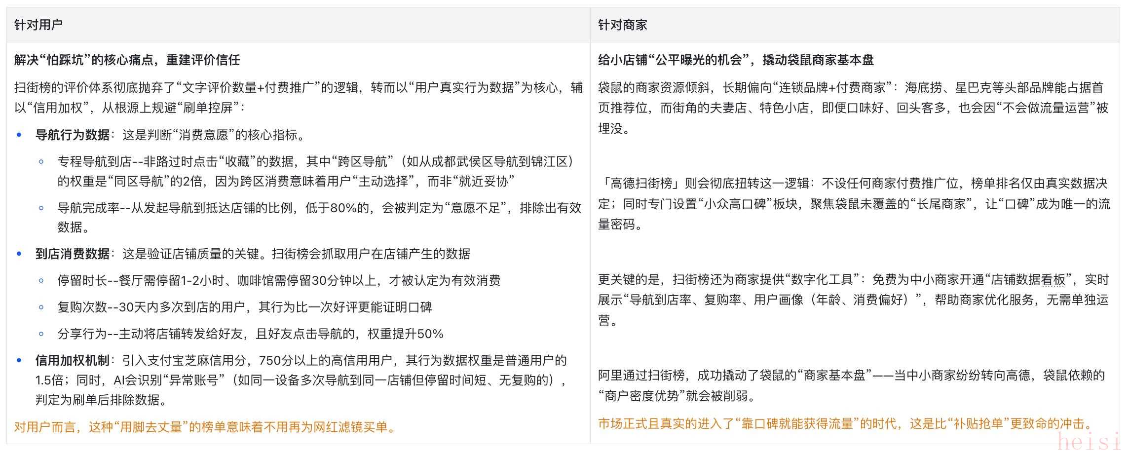 「高德掃街榜」的破局思路,正是用“去商業(yè)化+真實行為數(shù)據(jù)”重構(gòu)評價體系,同時精準(zhǔn)吸引被袋鼠“擠壓”的兩類核心群體——追求真實體驗的用戶,與渴望公平曝光的中小商家。