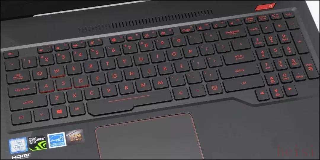 ▲該機的鍵盤布局非常有特色,F(xiàn)功能按鍵采用了四個一組的分離式設(shè)計;空格鍵左側(cè)加寬(因為玩游戲、打字時基本都是左手拇指去按空格鍵);光標鍵采用凸出式布局;WASD鍵采用了紅邊修飾,這是游戲本鍵盤的最典型設(shè)計。注意,該機可通過F5鍵快速把風扇轉(zhuǎn)速提升到最高