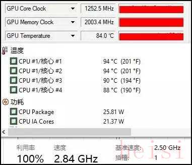 FX63VM在極限雙考機中(Furmark+Aida64系統(tǒng)穩(wěn)定性測試,室溫21℃),GPU的表現(xiàn)正常,溫度為84℃;不過CPU的溫度較高,可以達到94℃~96℃,CPU封裝功耗25.8W,頻率為2.84GHz,略超標準頻率的2.5GHz。溫度主要集中在C面鍵盤中部和C面中上部,鍵盤區(qū)域中部最高溫度可達56℃,不過好在鍵盤的WASD區(qū)域非常涼爽,溫度不到40℃,并不太影響游戲操控。