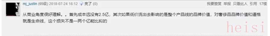 mj_justin:從商業(yè)角度很好理解。首先成本遠沒有2.5億,其次如果低價流出去影響的是整個產(chǎn)品線的品牌價值,對奢侈品品牌價值和逼格就是生命線,這個損失不是一兩個億能比擬的。