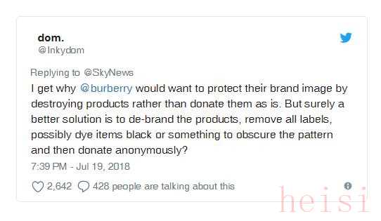 但有一名外國網(wǎng)友提出了一個問題。為什么一定要燒了?不能做去品牌化處理,比如拆了所有標簽,染別的顏色、圖案,然后捐了么?