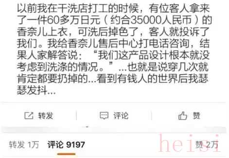 比如去年,女生買了一件35000元的香奈兒上衣,洗后掉色了,便打電話問客服??头f:不好意思,我們的產(chǎn)品從來不考慮洗滌。